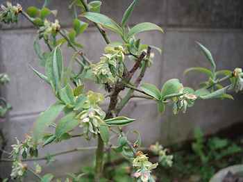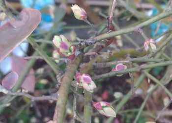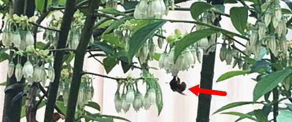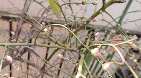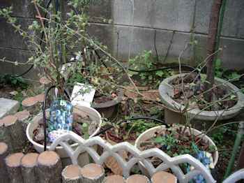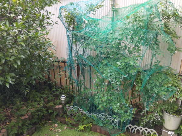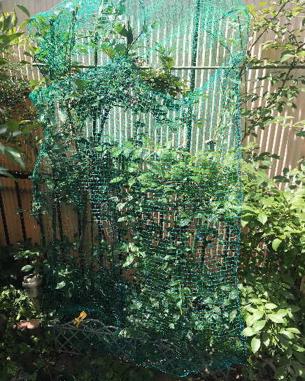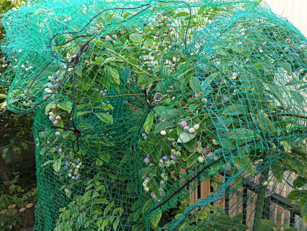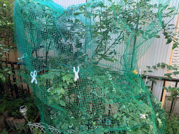 中型の鳥が来て花をついばんでいるのでネットをかけようと思ったが、目の小さなネットではミツバチなどが寄ってこないと困るので、目の大きさが10cm位のネットをかけておいて、花が終わって実が付きだしたら実の小さなネットに変える予定。