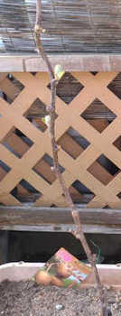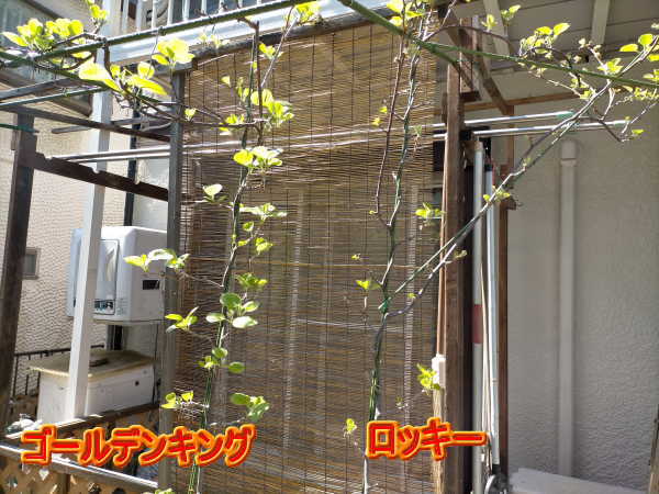 去年「ゴールデンキング」の下から2本V字型に枝が出ていましたので1メートルの高さでカットしていました。この枝に元気な葉を付け、さらに枝が伸びています。