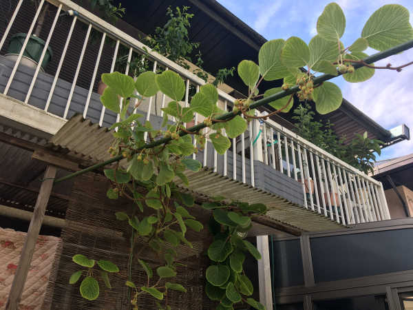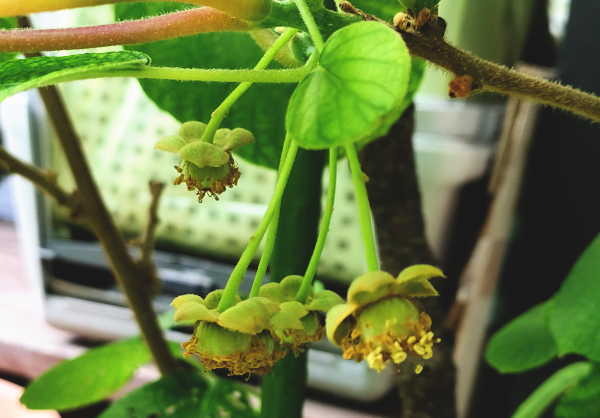 午前中は、時々小雨が降っていましたが、キウイはベランダの屋根下に置いているので、雨が止んが時を狙って人工授粉を行いました。