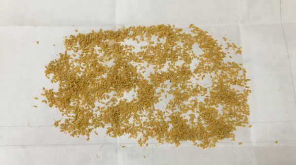 8個ぐらいの紙の包みに分けて冷凍保管していましたが、プラケースに全て入れると下記のように5ミリぐらいの厚みになりました。これは花粉のみ取り出さずに、葯も一緒に保管しているので量的には多く見えます。