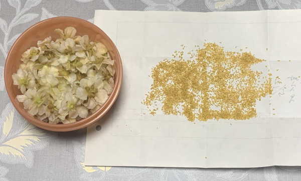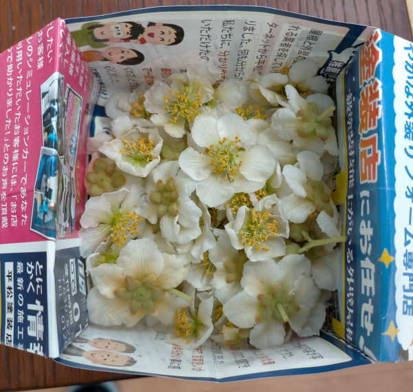 プロの果樹園の方は、葯を乾燥させ砕いて中の花粉のみ取り出すようですが、素人の私にはそのようなことが出来ないので、葯を半日~1日部屋で自然乾燥させてそのまま紙に包み冷凍保存します。