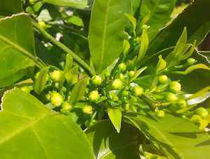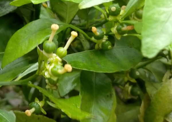 小さな蕾がミカンについていますが、まだ開花前なので消毒を実施。