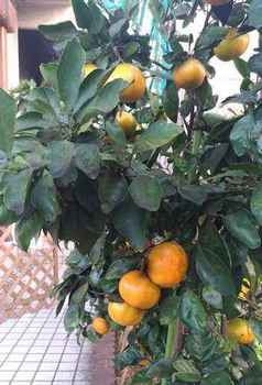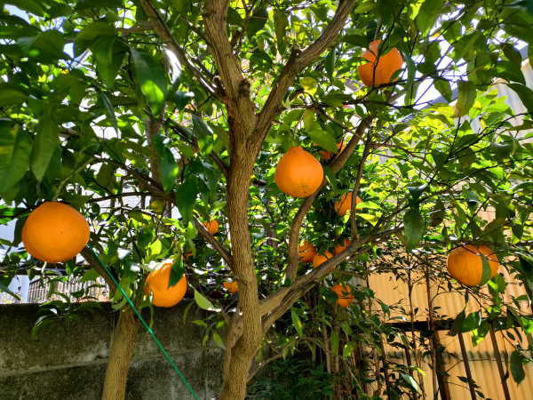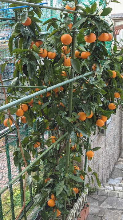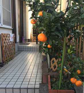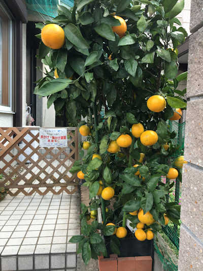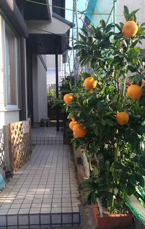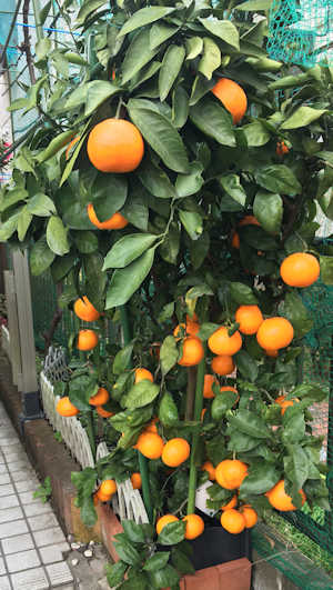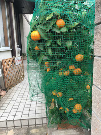 - 玄関横の植木升の「興津早生」にはたくさんの実がついている