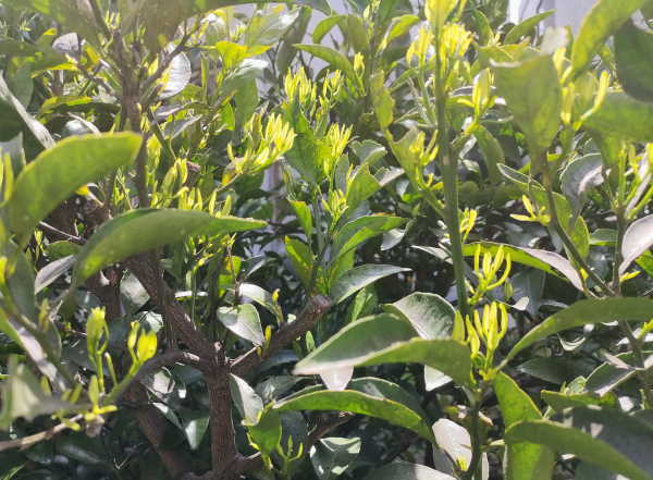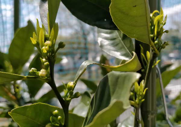 - みかん全体に新芽が出て、2mm前後のつぼみも。コナジラミがいたので消毒実施