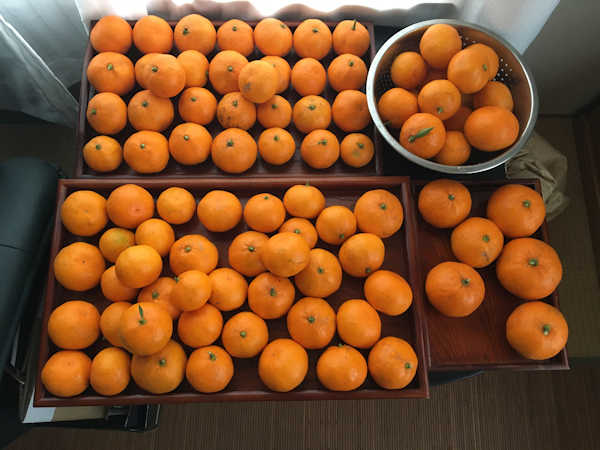 玄関横の植木升のミカン「興津早生」を全て収穫すると、約60個程ありました。