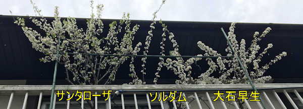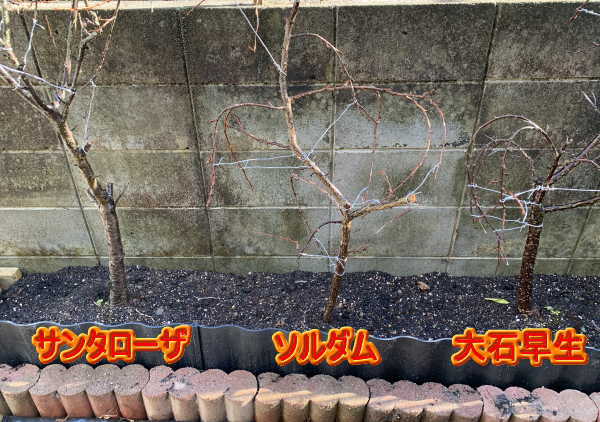 「サンタローザ」がほぼ満開で、他の「ソルダム」と「大石早生」はまだ6分咲きの状態です。