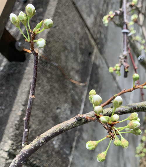 「サンタローザ」の花が6分咲き。他の「ソルダム」と「大石早生」はまだ蕾の状態です。去年よりも開花が 7~10日遅い。