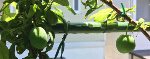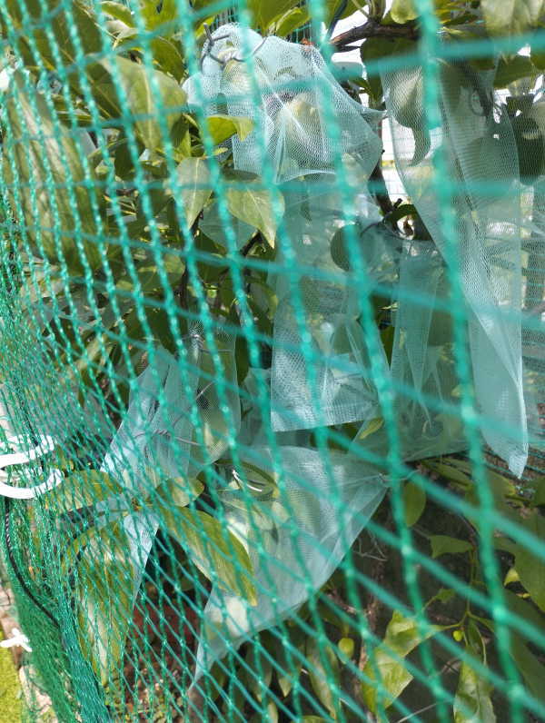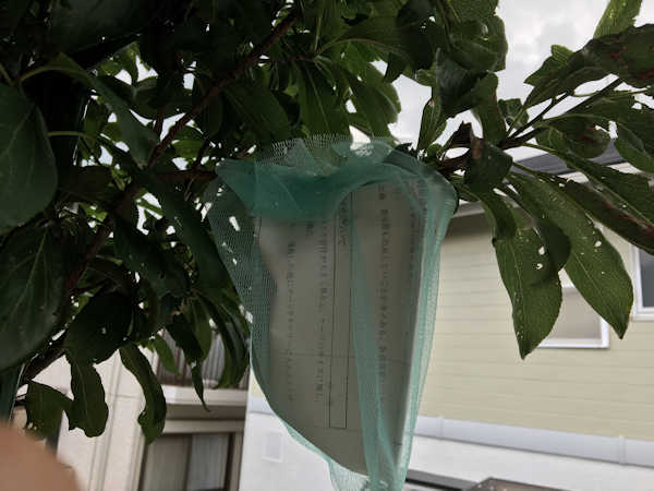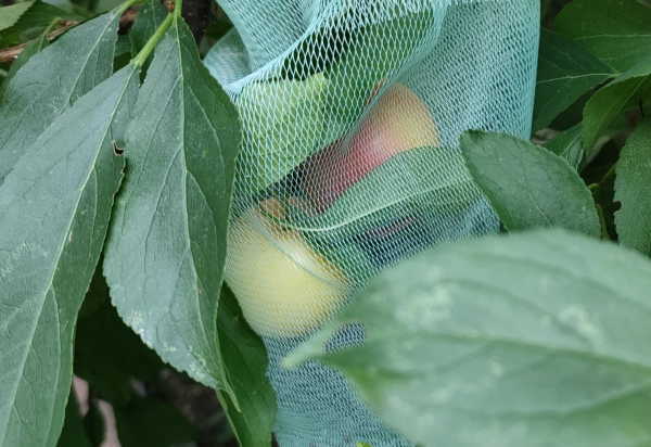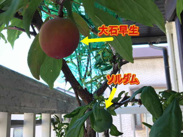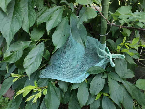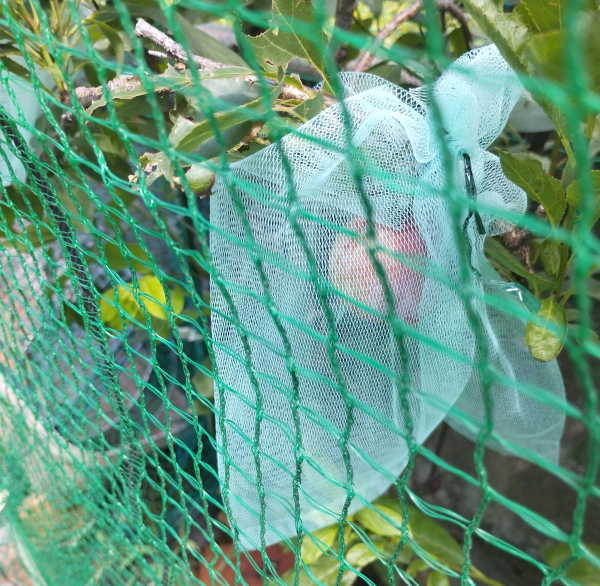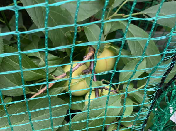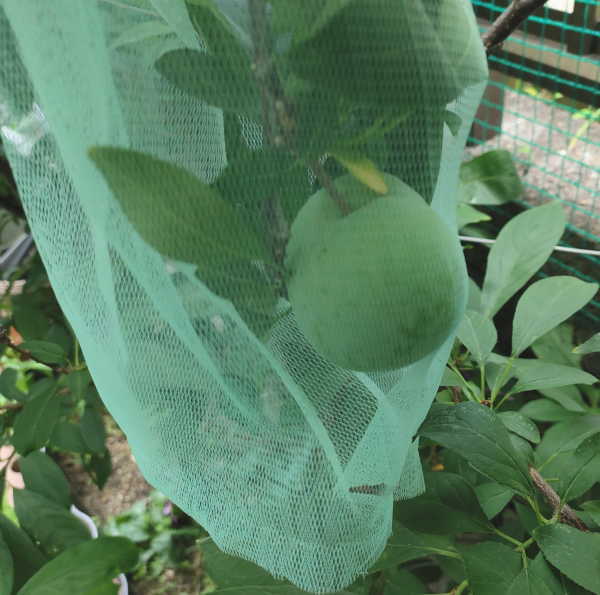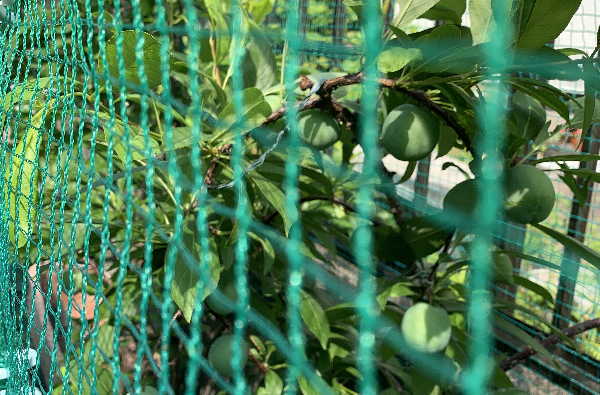 「サンタローザ」と「ソルダム」の実を探すと、それぞれ2個づつあったので、落下時の受け止めと鳥よけの目的でネットを被せた。