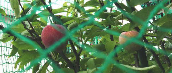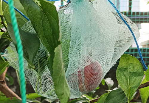 下記画像は「ソルダム」。小さな枝も一緒にネットを被せた。