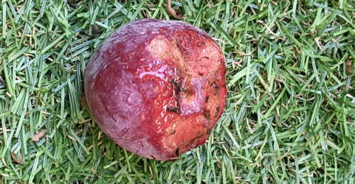 落下した実は当然、つつかれた実もアウト。9個しかない「サンタローザ」は残り2個となりました