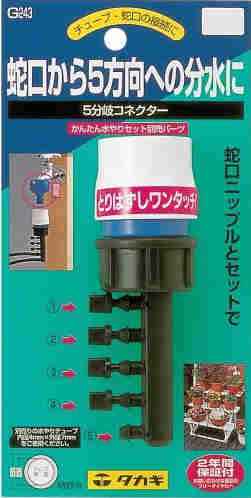 普通の太さのホースを途中で2分割し、それぞれのホースの先端にG243という5分岐(左画像)を取り付け細いホースとつなぐ。