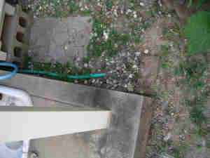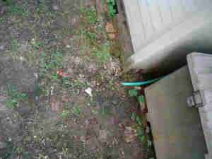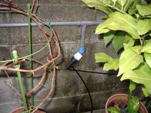 ホースで庭を横切って、さらにブロック塀沿いに各鉢までもホースをツギハギしていた。