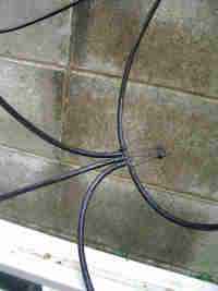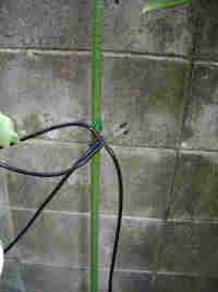 ブロック塀に長さ4cmのコンクリート釘を1~2cm打ち込み、これに塩ビのパイプを乗せて銅線で結びつけ固定した。