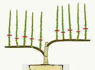 冬の剪定は、各節から上に誘引した新梢を 2節残し3節目の下でカットします。