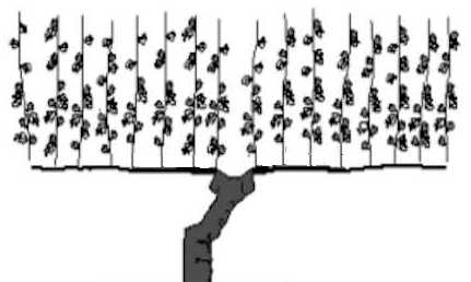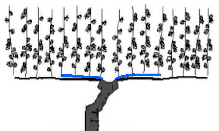 - 一文字の短梢剪定に似ているが、主枝が毎年更新されて、常に3年以内の若い状態に維持される