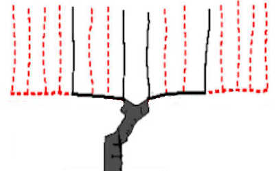 - 赤い点線の部分の枝をカットし、夏に伸びた枝を左右2本づつ残します
