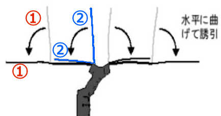 - ①の枝をまげて誘引した枝には、②の枝より外側にのみ新梢を付けます