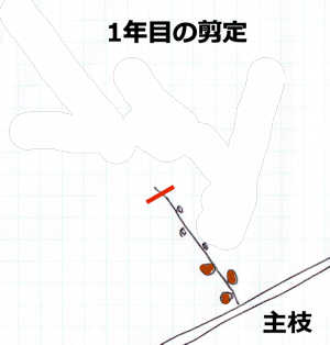 - 1年目の冬季の剪定(茶色は今年ついた実の位置)