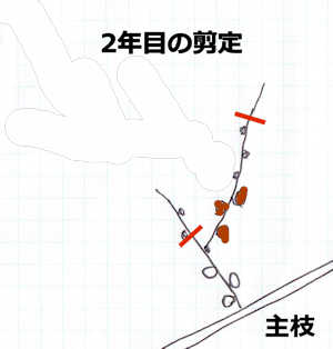 3年目の剪定時には結果母枝の更新をした方がジャングル状態にならずに手入れできそうです。