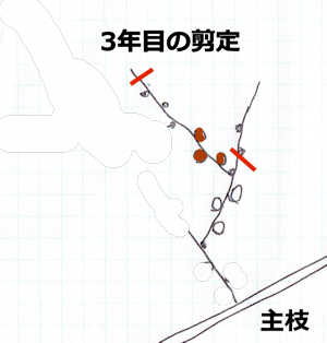 3年目の冬季の剪定(茶色は今年ついた実の位置)
