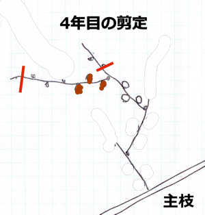 - 4年目の冬季の剪定(茶色は今年ついた実の位置)