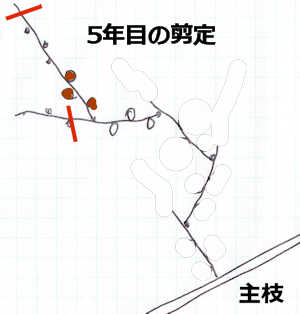 - 5年目の冬季の剪定(茶色は今年ついた実の位置)
