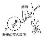 - 前年に花の着いた節には芽が形成されないので今年ここから枝は発生しません。前年実がついた芽の先の節から今年枝が発生し花が着きます
