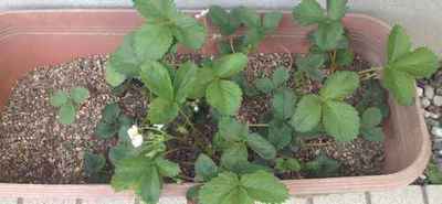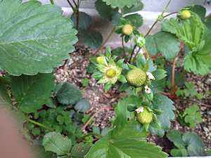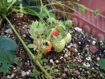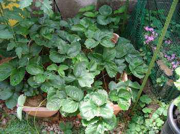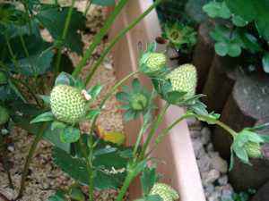 - イチゴが大きく育ち、花もつぼみも増えてきた