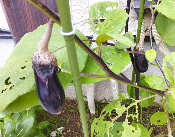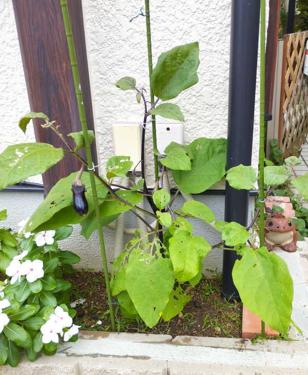 女房が7月にもらってきたナスを玄関横の小さな花壇に植えていました。