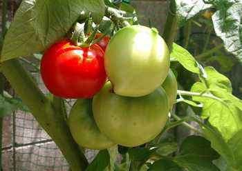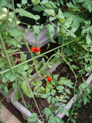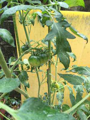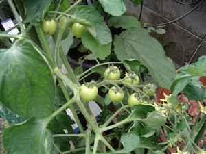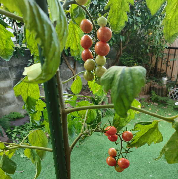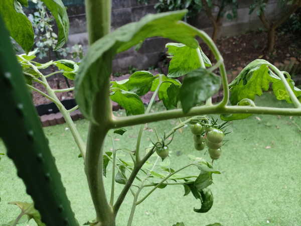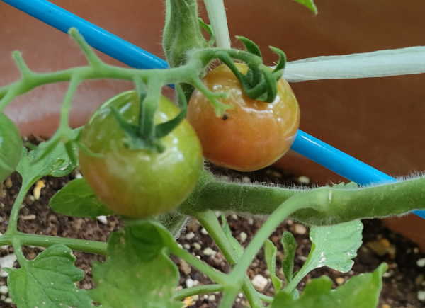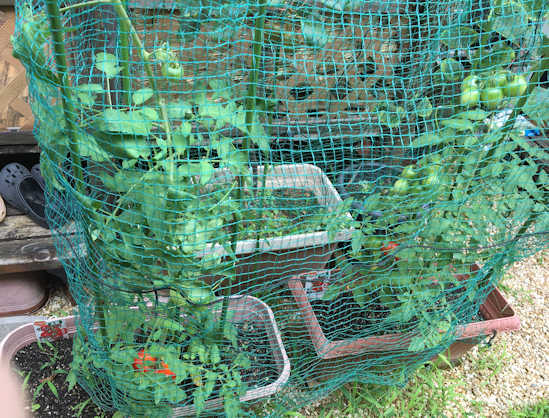 スモモとブルーベリーが鳥に食い荒らされたので、色づき始めたトマトにもネットを張りました。
