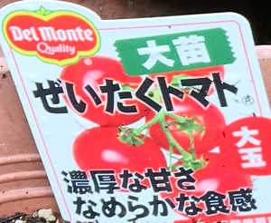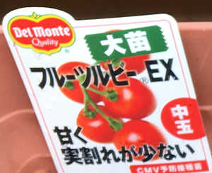 ミニトマトは「接木のベリーガーデン」、大玉は「デルモントのぜいたくトマト、濃厚な甘さ」という銘板が付いていた。