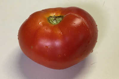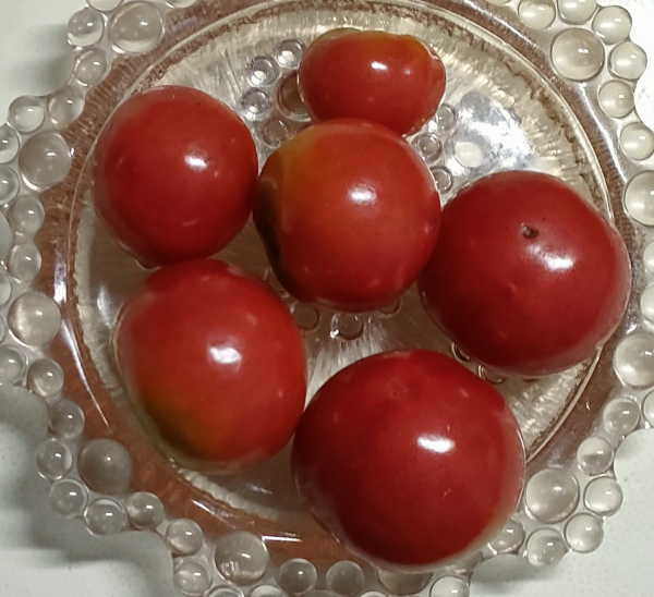 よく見ると、連日の雨で大玉トマトの第1花房の実に少し割れが出たので収穫してみた。