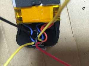 注意・・・・・横から配線を引き出した場合は、ブラブラさせておくとプロペラと干渉するので、LEDと接続しないときはバッテリーと一緒にベルトで固定します。