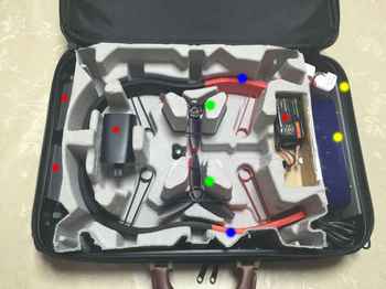 本体を取り出した後の部品です。 ●バッテリー4個 ●屋内用ハル左右 ●予備のプロペラ ●TL-WA830RE とバッテリー |