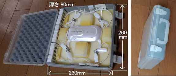 現在は蓋に貼ってある凸凹のスポンジと蓋の間に、中継機、中継機用バッテリー、予備のプロペラを挟んで収納しています。