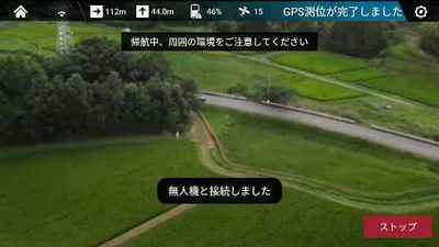 (3) 水平距離 112m、高度 44m (直線距離 121m) ここで再接続されましたが、4~5秒後にまた接続が切れました。 このあたりで自動帰還が働いたようです。 |