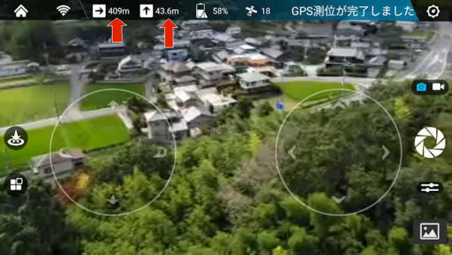 結果は、飛行距離 409m、高度 44m でもまだ十分余裕がありましたが、バッテリー残量が心配になり中断しました。