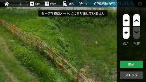 機体の電源を入れ駐車場の屋根(高さ2.5m)に置いて、スマホとの接続が完了してからスマホを高さ1.5mで持って歩きました。
