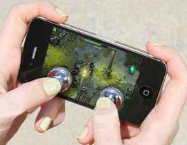 Logitech joystick for iPad というシリコンゴムのような素材で渦巻状のパッドを、 iPad に吸着して使用する。