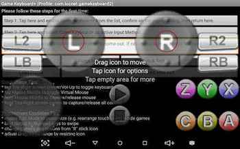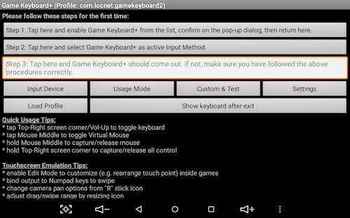 - Android の「設定」->「言語と入力」->「現在のキーボード」で 〇 Game Keyboard+ に変更して、操作したいアプリを起動。