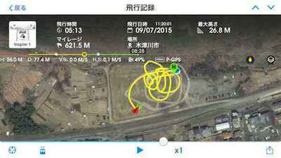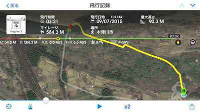 今回の飛行中に機体との接続が切れることは無かったが、100mの位置で機体を左右に回転してもスマホの画面に映っている画像がすぐ変化しないので、画像で向きを確認することが出来なかった。