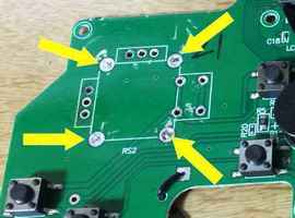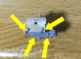 | 左右のスティックの金属ケースの足の部分のハンダ付けがなかなか取れないので、スティックケースの足のみ表側からニッパーでカットしました。 黄色の矢印の部分がカットしたケースの足の部分です。 |
