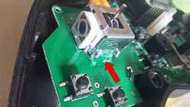 取り外したスティックの部品です。 周りのボリュームやスイッチは3~4本足なので部品単位に一気に溶かして細いドライバーで少し持ち上げ、横も同じように溶かして少し持ち上げるようにして順に根気良く少しずつ浮かして外します。 |