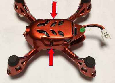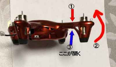 | まず機体両サイドにある小さなネジを外します。 | ①の部分を押さえながら、モーターの部分を②の矢印のように持ち上げると、③の部分のつなぎ目が開き、上下のケースが離れます。 上下のケースの間に薄いドライバーのようなものを差し込み、隙間を開くようにすると外れやすくなりました。 |