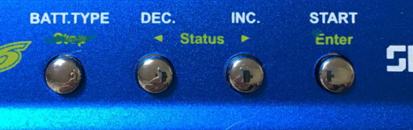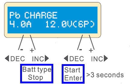 “Dec”と“Inc”ボタンで設定したあと、”Battery Type/Stop”ボタンを押すと設定を保存できます。