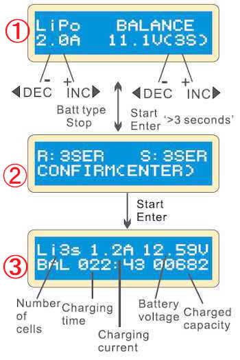 もしセル数が異なった場合は、“BATT.TYPE”ボタンで前の画面にもどり、もう一度正しいセル数を入力し直して下さい。
