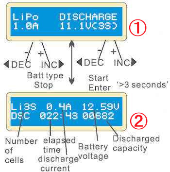 “Dec”か、“Inc”ボタンで、「LiPo DISCHARGE」を選択します。