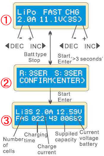 ①の画面では、左上段にユーザーが設定した電池の種類、下段左に充電電流、下段右に電圧(セル数)を表示しています。