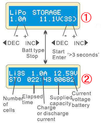 “Dec”か、“Inc”ボタンで、「LiPo STORAGE」を選択します。