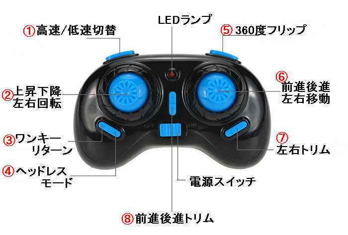 ワンキーリターン/ ヘッドレスモード/360度宙返り/高速・低速切替 低電圧保護回路・・・バッテリー残量が少なくなるとLEDがゆっくり点滅する。 |